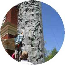 Climb the rock wall, three at a time. Harnesses keep the climber safe, but free to move at their own speed and path. Must be 40lbs.